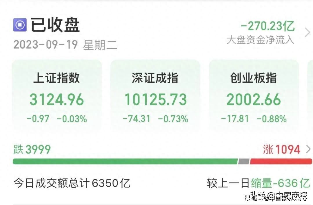9月19日,沪指全天维持窄幅震荡,上证指数开盘报3123.99点,下跌0.06%,截至收盘,沪指报3124.96点,下跌0.03%,成交额为2741亿元。深证成指、创业板指分别低开0.15%和0.13%。截至收盘,深成指报10125.73点,下跌0.73%,成交额为3609亿元;创指报2002.66点,下跌0.88%,成交额为1596亿元。