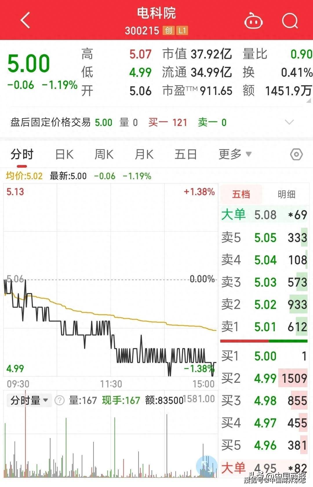截至今日收盘,电科院的股价下跌1.19%。有股民评论,“这剧情都可以拍电视剧了,而且雷还多”“这就是典型的公司经营得不怎么样,事情还特别多,动不动就给你爆个雷”……(注:图片来源于同花顺,本文不构成任何投资建议。)(记者 马文博)