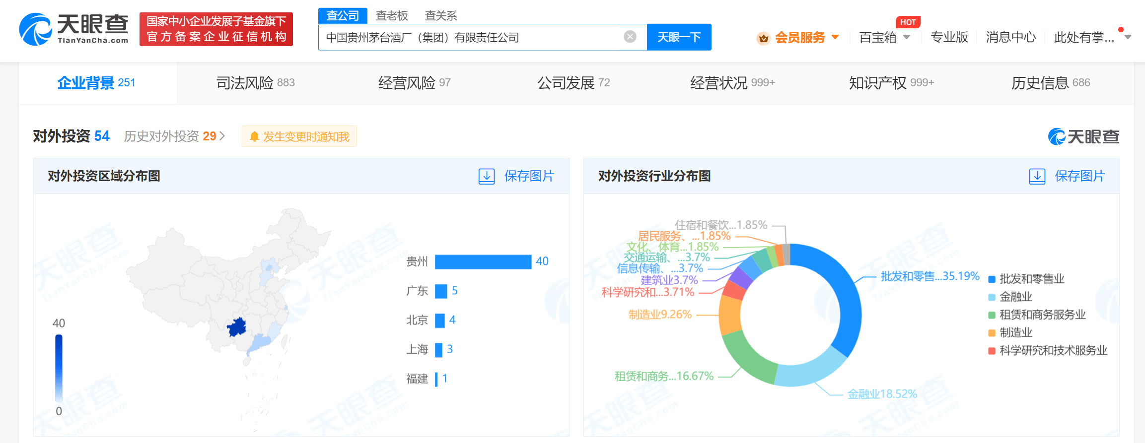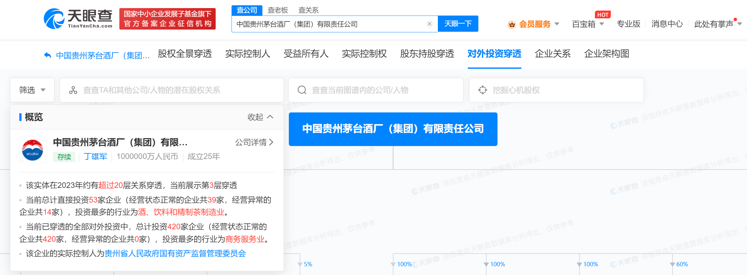 对外投资信息显示,该公司直接持股50余家企业,其中40家为存续状态,包括贵州茅台(600519)、中国贵州茅台酒厂(集团)文化旅游有限责任公司、茅台(贵州)私募基金管理有限公司、贵州茅台集团营销有限公司、贵州茅台(集团)生态农业产业发展有限公司等,除酒业及相关贸易、营销公司外,其版图还涉及餐饮、酒店、地产、农业,并投资保险、金融、广电、银行等。通过直接或间接持股,该公司拥有上百家企业的实际控制权。
