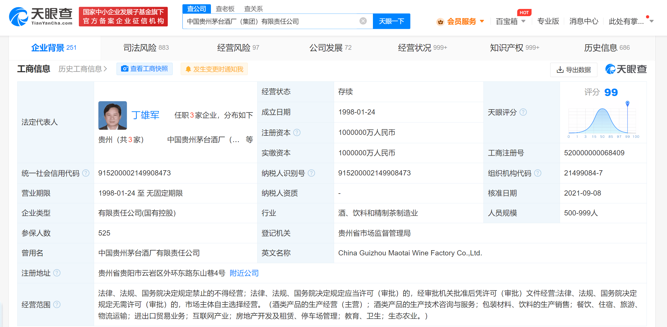 天眼查App显示,中国贵州茅台酒厂(集团)有限责任公司成立于1998年1月,法定代表人为丁雄军,注册资本100亿人民币,经营范围含酒类产品的生产技术咨询与服务,包装材料、饮料的生产销售,餐饮、住宿、旅游、物流运输,进出口贸易业务,互联网产业,房地产开发及租赁等,由贵州省国资委和贵州省财政厅下属的贵州金融控股集团有限责任公司分别持股90%、10%。