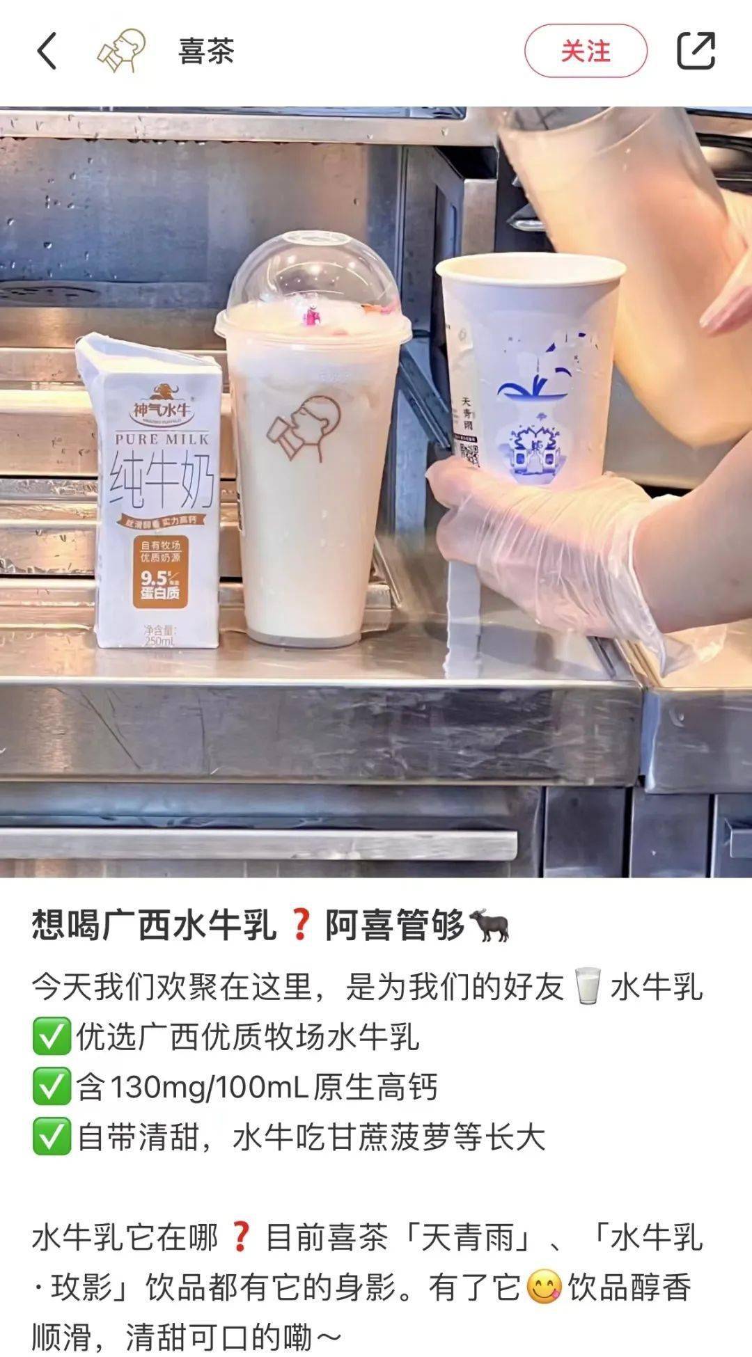 紧接着,喜茶也站上了互联网“冲浪”第一线,一则“想喝广西水牛乳?阿喜管够”的推文将这件原本只属于一家品牌的热闹扩散到了整片新茶饮市场中。