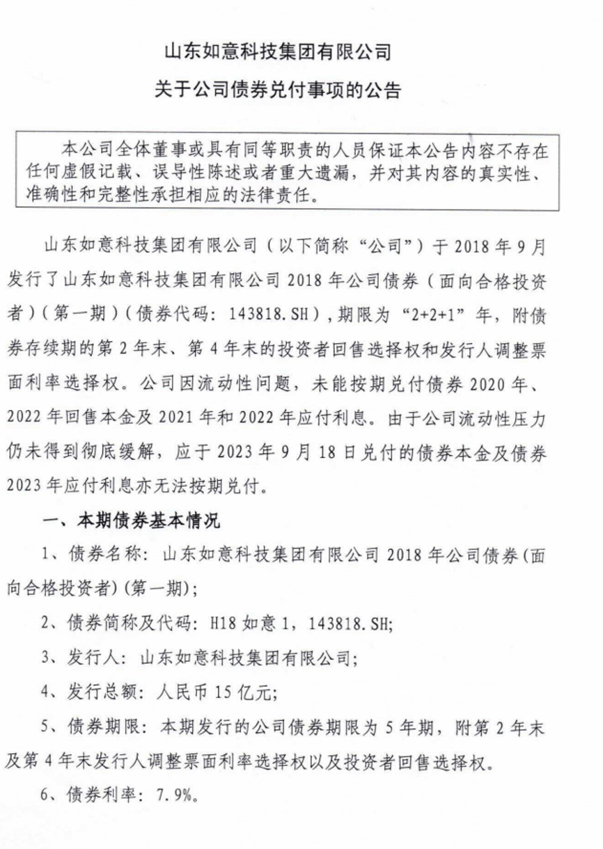 9月18日,山东如意科技集团有限公司(简称“山东如意”)发布关于公司债券“H18 如意1”兑付事项的公告。