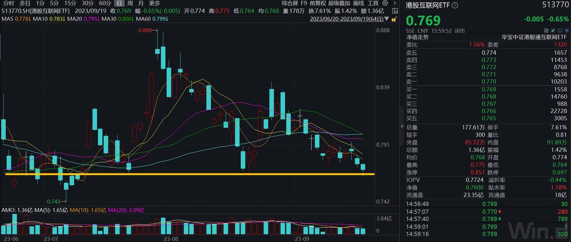 场内热门ETF方面,截至15:00收盘,港股互联网ETF(513770)场内价格收跌0.65%,收盘价再度回到7月24日低点,日成交额萎缩至1.36亿元。