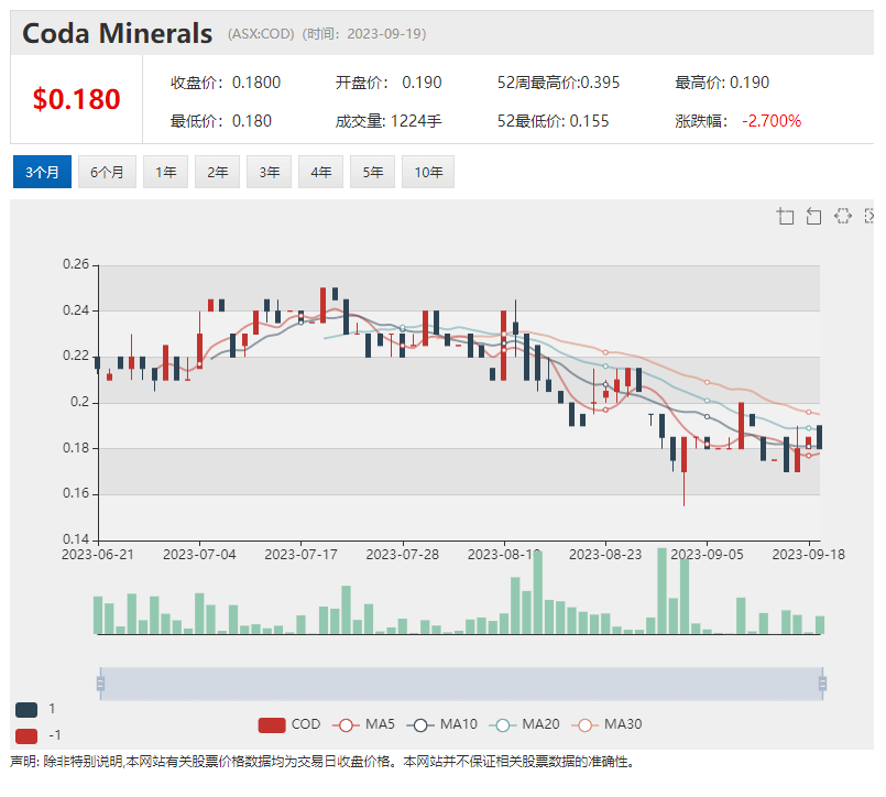 【52周股价区间】:0.27-0.86澳元 【最新收盘价】0.338澳元 (备注:截至9月12日周二收盘价)