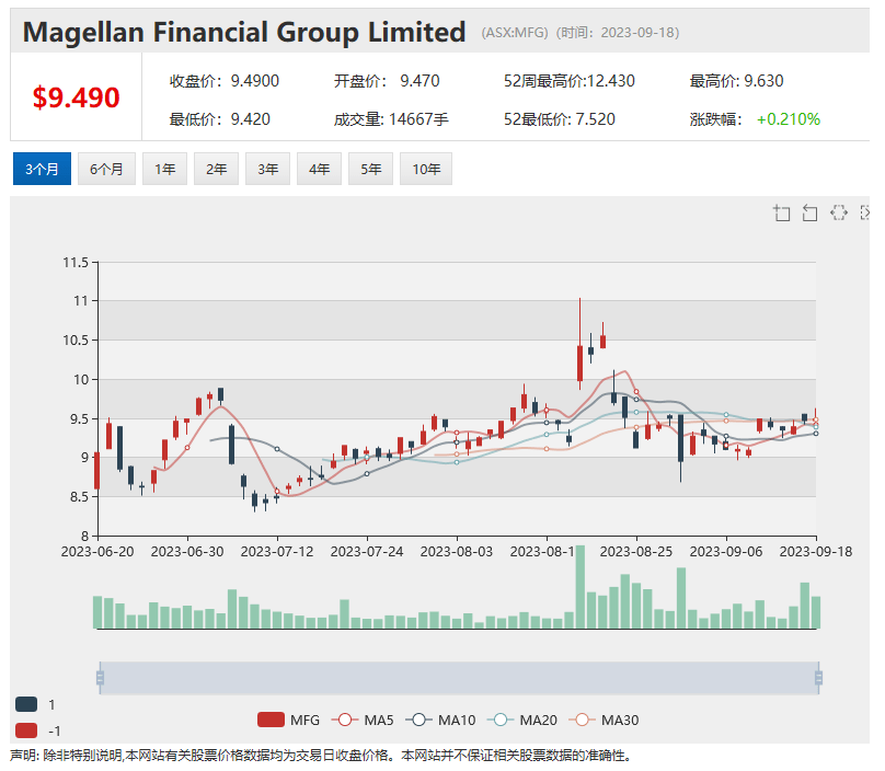受该消息影响,Magellan股价周一早盘上涨。11:31成交价为9.59澳元,上扬0.12澳元,涨幅1.27%。该股近一年的投资回报率为亏损23.40%。