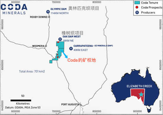自上市伊始,作为COD旗舰资产的伊丽莎白溪项目就因其身处“大象之乡”而备受投资人青睐:伊丽莎白溪毗邻多个大规模铜矿场,距必和必拓庞大的奥林匹克坝铜矿以南仅约100公里,距Carrapateena矿场以西40公里,距橡树坝铜矿——近50年来最大IOCG发现——仅16公里(见下图)。