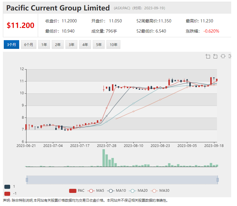公告发布后,Pacific Current股价周二早盘下跌。11:19成交价为11.18澳元,下跌0.09澳元,跌幅0.80%。该股近一年的投资回报率为57.02%。