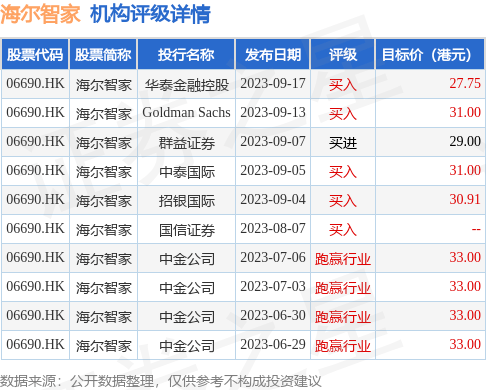 截至2023年9月19日收盘,海尔智家(06690.HK)报收于24.4港元,上涨1.88%,换手率0.21%,成交量594.81万股,成交额1.44亿港元。投行对该股的评级以买入为主,近90天内共有5家投行给出买入评级,近90天的目标均价为31.3港元。华泰金融控股最新一份研报给予海尔智家买入评级,目标价27.75港元。