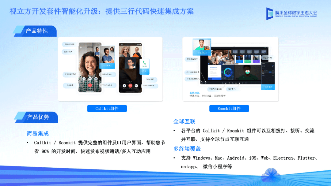 腾讯云视立方终端开发套件此次也面向全行业推出TUICallKit和TUIRoomKit两款音视频低代码TUIKits方案,升级后的智能开发套件能帮助企缩减高达90%的开发时间。同时,腾讯云视立方终端开发套件还集成了互动直播、短视频制作、视频播放、美颜特效等多种终端能力于一体,开发者仅需一次集成SDK即可实现所有音视频终端能力,更加便捷与智能。