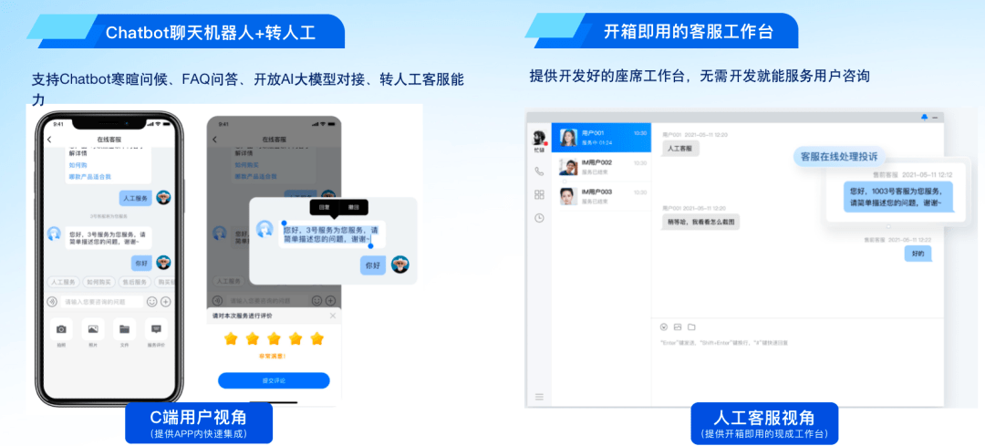 腾讯云即时通信IM作为全球领先的通信云服务,也看到了AI在即时通信场景的巨大潜力,快速发布了相关AI能力调用接口,推出了Chatbot聊天机器人和人工客服插件。这些插件能帮助企业轻松实现机器人初步的寒暄、FAQ问答以及后续的人工客服转接。而且,腾讯云IM还提供了即开即用的客服工作台,使得企业可以无需开发就直接使用,进而在其网站、APP、公众号以及小程序等各种平台上快速集成客服功能。
