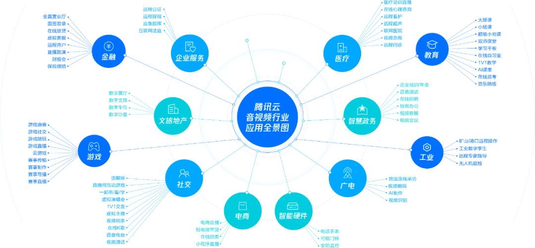 除了在消费领域提供音视频服务外,腾讯云音视频已经为医疗、金融、教育、娱乐、工业等诸多领域提供了超低延时、超高清、沉浸式的音视频解决方案。