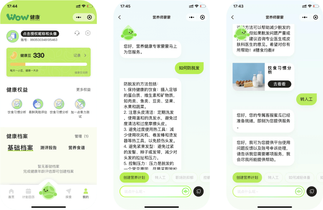 在日前举办的蒙牛全球合作伙伴答谢会上,蒙牛健康营养师「蒙蒙」作为行业内首个可交互AI「智能营养健康专家」,将基于蒙牛「WOW 健康 +」小程序为消费者带来多场景、多功能的健康服务,实现更立体、更有温度的情感交互体验。
