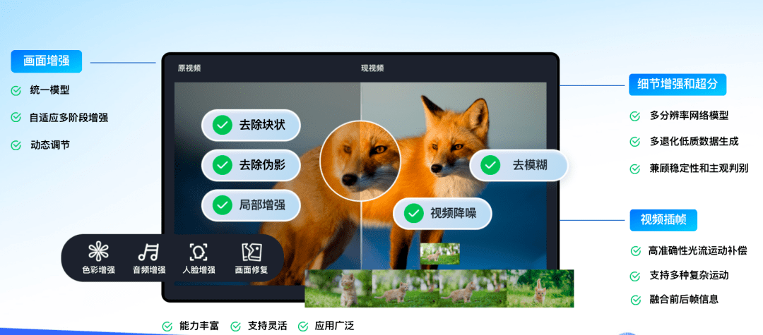 同时针对源视频质量不佳的场景,腾讯云媒体处理还支持音视频修复增强等相关能力,通过对视频进行自适应质量分析、多退化数据生成方案和多帧特征对齐融合的算法模型,大幅提升视频清晰度和色彩丰富度,致力于为用户打造超高清、沉浸式的音视频体验。