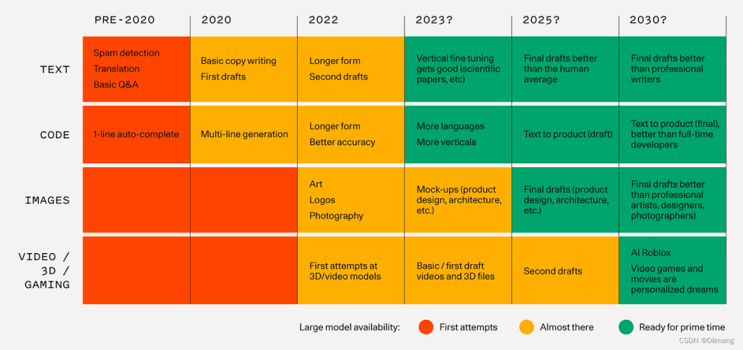 在内容类型上,AIGC涵盖了文本、音频、图像、视频、代码以及多模态等多种内容形式。据红杉资本去年9月的估计,AIGC的实际应用推进顺序为:文本和代码领先,其次是图像,然后是视频、3D和游戏。