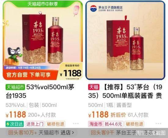北京商报记者分别登录习酒、郎酒以及天猫超市对比发现,茅台1935在天猫超市中仅超200人付款。而对比习酒与郎酒来看,君品习酒在其官方旗舰店内已售超1000笔;青花郎在其官方旗舰店内已售超2000笔。