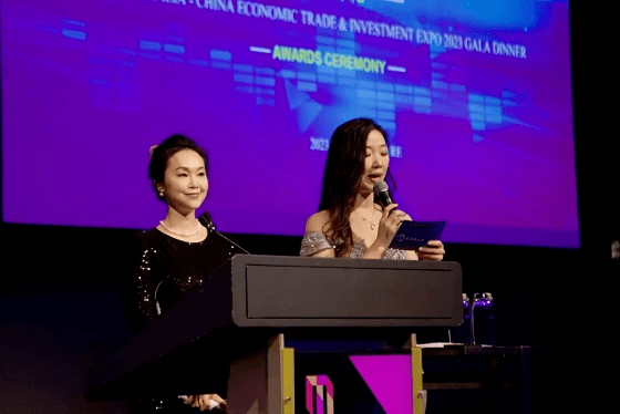 接着,澳中博览会CEO田思和主持人一起主持澳中博览会奖的颁奖典礼。她介绍道: 澳中博览会奖,是由组委会对于澳中经贸及多元文化社会做出贡献的企业和个人,对于造福双边人民生活的优质品牌创立的奖项,旨在鼓励交流,携手共赢,在更新更高的层面推动双边的经贸合作文化交流。它和澳中博览会周期一致,按年度颁发。它既是一种荣誉,也承载着责任和情怀。