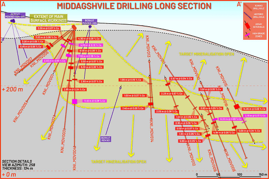Middagshvile 长剖面图显示了Kuniko 过去两年发布的所有相关钴拦截位置 来源:Kuniko Ltd 官网)