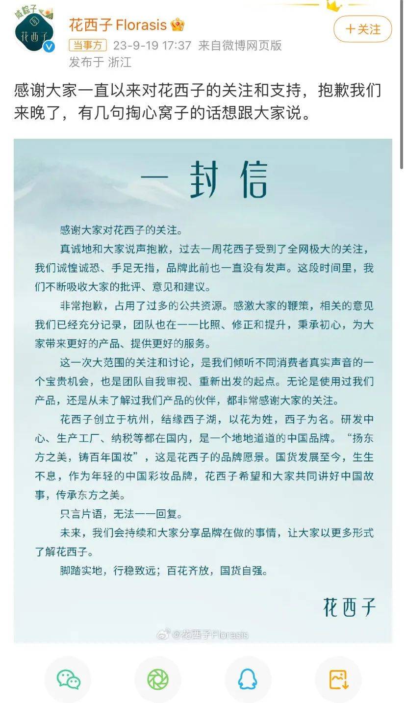 9月19日17时许,花西子官方微博发布致歉声明,称感谢大家一直以来对花西子的关注和支持,抱歉我们来晚了,过去一周受到全网极大关注,相关意见已充分记录。具体如下: