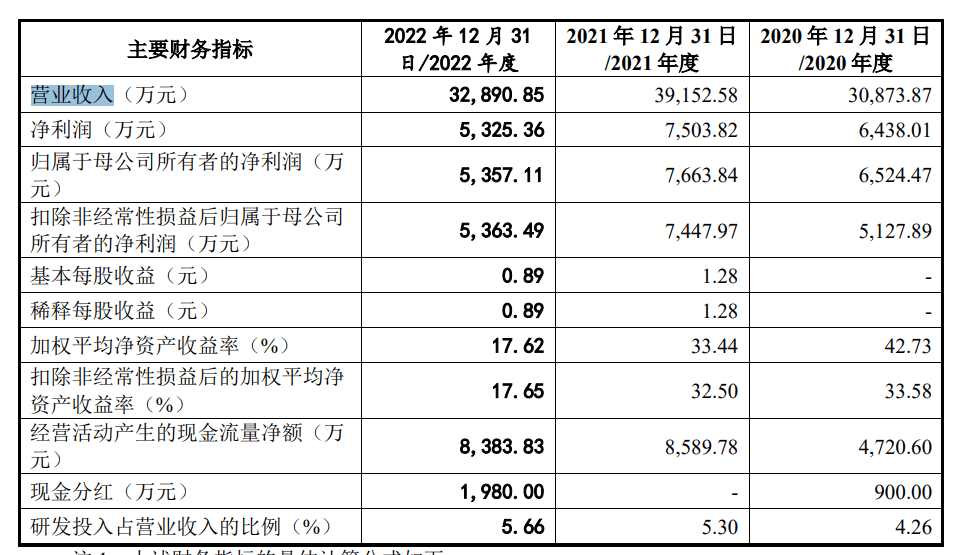 业绩方面,2020年-2022年,鼎佳精密营收分别为3.09亿元、3.92亿元、3.29亿元;净利分别为6438.01万元、7503.82万元、5325.36万元。其中鼎佳精密2022年扣非归母净利润为5363.49万元,低于6000万元。