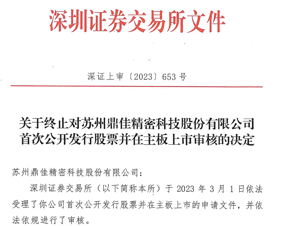 乐居财经 李兰9月19日,深交所近日发布关于终止对苏州鼎佳精密科技股份有限公司(以下简称“鼎佳精密”)首次公开发行股票并在主板上市审核的决定。