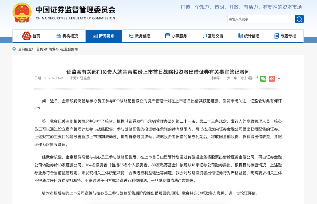 据证监会官网,有提问称,金帝股份高管与核心员工参与IPO战略配售设立的资产管理计划在上市首日出借其获配证券,引发市场关注,证监会对此有何评价?
