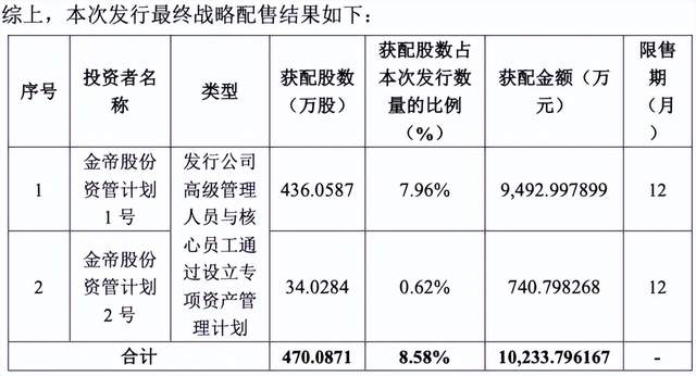 据金帝股份配售结果显示,其战略投资者为“金帝股份资管计划1号”和“金帝股份资管计划2号”。两项资管计划的参与人为金帝股份及子公司的实际控制人、高级管理人员及核心员工等。