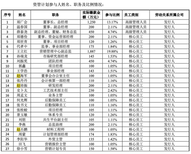 资管计划1号参与者共39人,第一名为郑广会,参与比例达13.17%。除此之外,上到公司的董秘、副总经理,中到研发经理、业务主管,下到后勤保障员工等39人均参与了1号资管计划。其中赵培振为赵秀华弟弟、郭鑫为郑广会外甥。