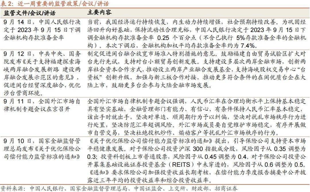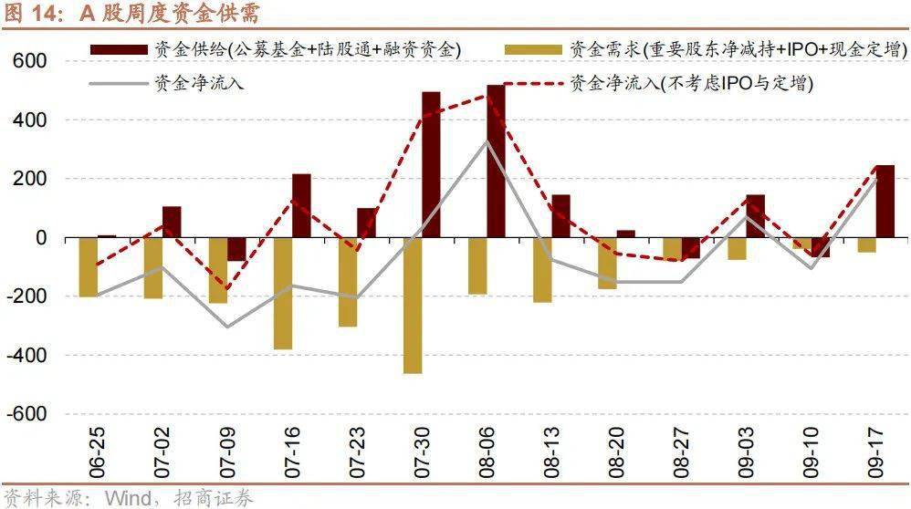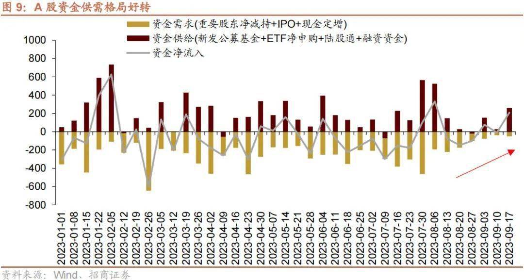 继8月以来一系列活跃资本市场、提振投资者信心的政策发布,股票市场供需格局已经有所改善。尤其IPO、再融资、减持等构成的资金需求端规模明显收窄。当前股票市场的资金供需格局已经明显改善。资金需求端, IPO、再融资、减持等规模连续收窄;资金供给端,外资流出造成一定负面影响,但ETF整体持续净申购,且9月以来融资资金已连续三周净流入,上周融资净买入规模达到424亿元。可见两融资金的风险偏好已经修复,融资余额企稳回升。外资延续流出但相比8月已经有所收敛。随着积极因素不断积累,市场或有望重拾信心,蓄力上行。