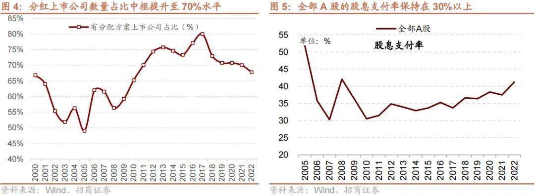 随着分红政策不断完善,分红上市公司数量占比中枢已提升至70%水平。分红政策不断完善以来,A股分红上市公司数量占比持续提升,目前分红上市公司数量占比也从2010年以前的50%左右提升至近几年70%的中枢水平,分红上市公司数逐步增长。并且从股息支付率(分红金额占净利润的比例)来看,2010年以来A股上市公司整体的股息支付率稳步提升,一直处于30%以上,到2022年超过了40%,这也进一步表明在今年来A股上市公司的分红水平有所提升。