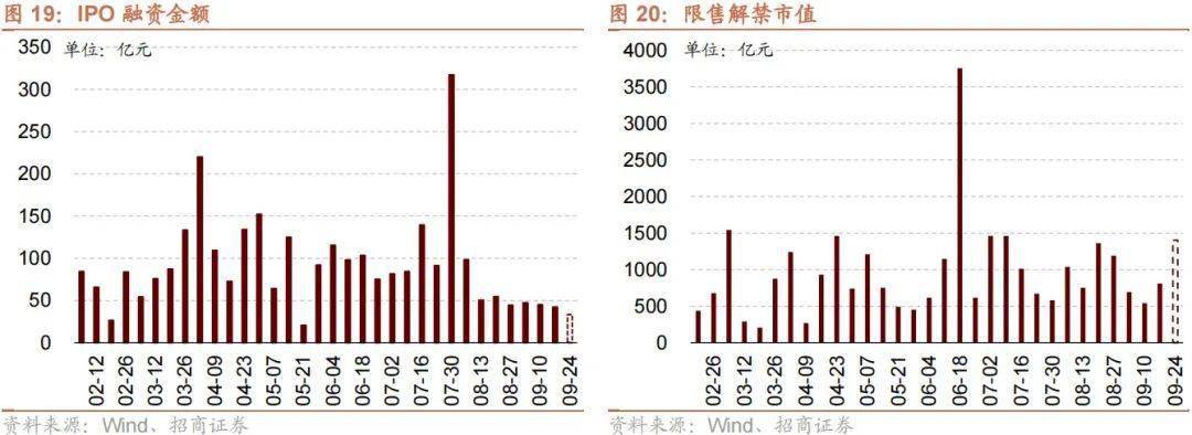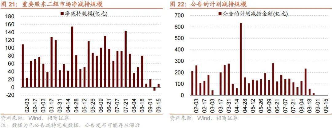 资金需求方面,上周(9/11-9/15)IPO融资金额回落至42.4亿元,共有5家公司进行IPO发行,截至9月15日公告,未来一周将有4家公司进行IPO发行,计划募资规模33.3亿元。重要股东由净增持转为净减持,净减持8.2亿元;公告的计划减持规模0.0亿元,较前期持平。