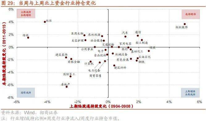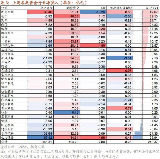 行业偏好上,上周(9/11-9/15)医药生物、电子、汽车获各类资金净流入规模较高。上周陆股通净流出152.1亿元,净买入规模较高的行业为医药生物、汽车、传媒,买入金额分别为35.5亿元、14.9亿元、7.6亿元。净卖出规模较高的行业是电力设备、食品饮料、非银金融等行业。融资资金净流入424.4亿元,净买入规模较高的行业为电子(+46.5亿元)、电力设备(+34.5亿元)、计算机(+33.9亿元)等行业,净卖出的行业仅综合(-0.1亿元)。
