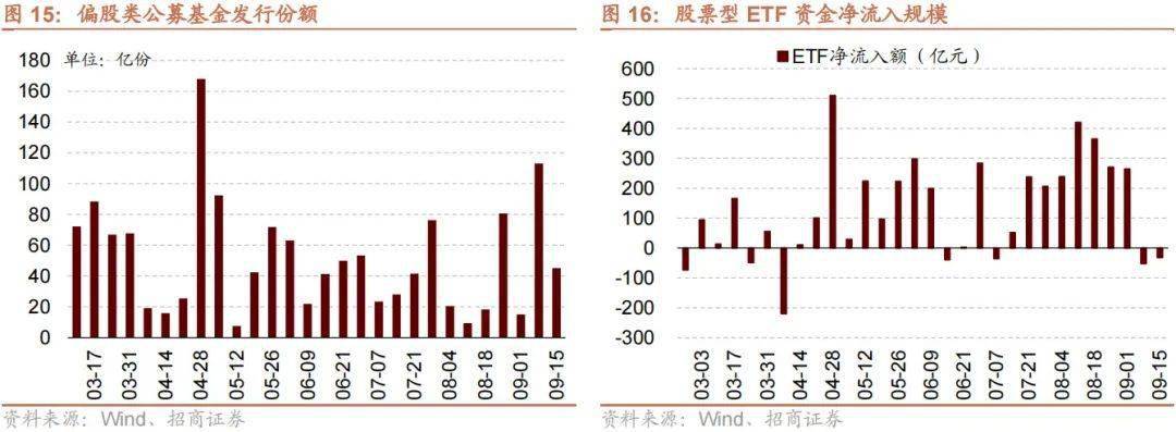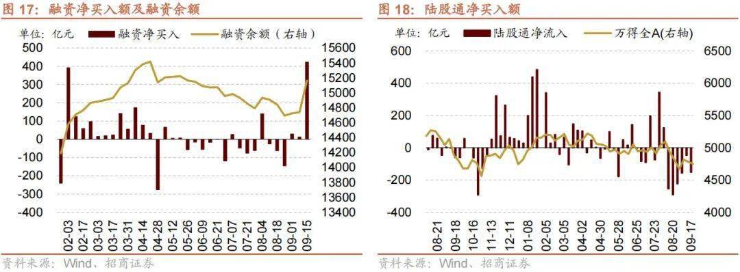 资金供给方面,上周(9/11-9/15)新成立偏股类公募基金45.2亿份,较前期减少67.9亿份。股票型ETF较前期净流出,对应净流出32.0亿元。上周整个市场融资净买入424.4亿元,净买入额较前期扩大409.9亿元,截至9月15日,A股融资余额为15164.0亿元。陆股通上周净流出,当周净流出规模为152.1亿元,净卖出额较前期扩大104.5亿元。