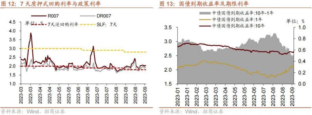货币市场利率上行,R007与DR007利差缩小;短、长端国债收益率上行,期限利差缩小。截至9月15日,R007为2.02%,较前期下行1.1bp,DR007为1.91%,较前期上行4.5bp,两者利差缩小5.6bp至0.12%。1年期国债到期收益率上升3.7bp至2.13%,10年期国债到期收益率上升0.2bp至2.64%,期限利差缩小3.5bp至0.51%。