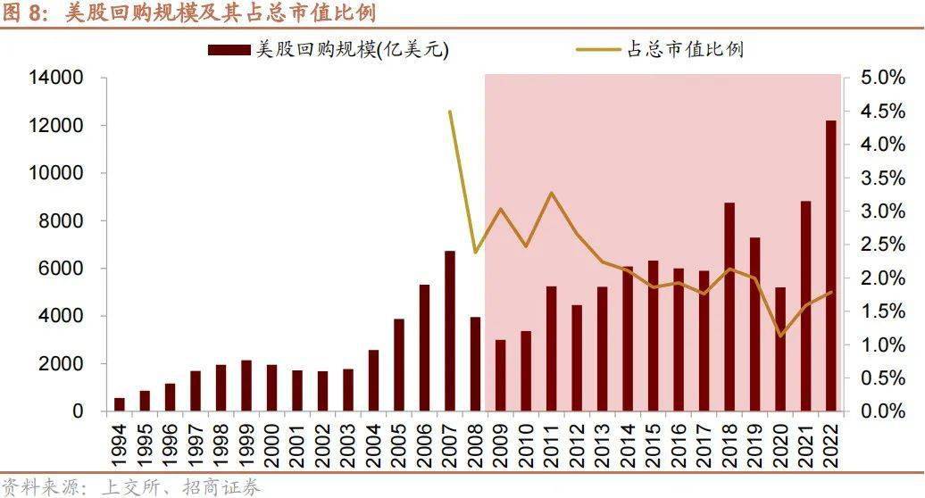 另外,回购也被视为上市公司回馈股东的方式之一。2009年以来,美股回购规模逐年攀升,从2009年的回购3000亿美元,升至2022年的回购1.22万亿美元,每年的回购规模占美股总市值的比例基本在2%左右。对比之下,A股回购规模偏低,未来随着A股上市公司的回购进一步常态化,回购也有望逐渐成为推动A股上涨的动力之一。