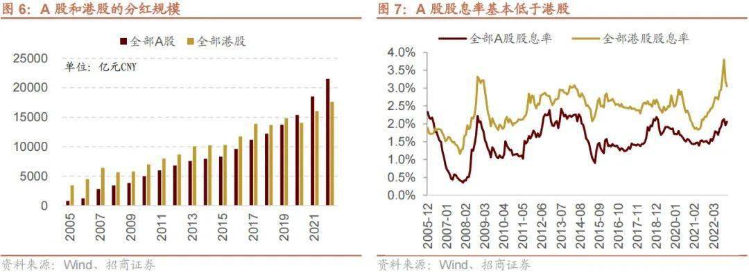 对比A股和港股,两个市场的分红规模逐年扩大,且近几年A股的分红总规模已经超过港股,不过A股的股息率基本一直低于港股。