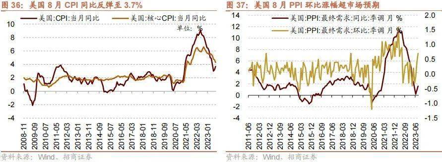 美国CPI同比反弹至3.7%,美国PPI环比涨幅创14个月新高。9月13日,美国劳工统计局公布最新数据显示,在能源价格上涨的带动下,美国8月份CPI同比上涨3.7%,略高于市场预期的3.6%水平,前值为3.2%。环比涨幅也从7月份的0.2%上升至0.6%,符合市场预期,为14个月来最大的环比涨幅。剔除波动较大的食品和能源价格后,美国8月份核心CPI同比上涨录得4.3%,较前值4.7%有所回落;但是核心CPI环比上涨0.3%,超过市场预期及前值0.2%的水平。9月14日,美国劳工部公布数据显示,经季节性调整后,8月美国生产者价格指数(PPI)环比上涨0.7%,涨幅超过市场普遍预期,创2022年6月以来最大单月增幅。