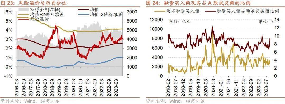 上周(9/11-9/15)融资买入额为3165.7亿元;截至9月15日,占A股成交额比例为9.4%,较前期上升,融资资金交易活跃度增强,股权风险溢价上升。