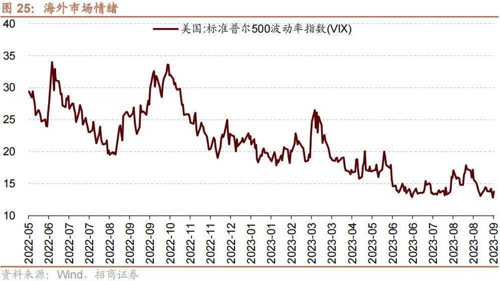 上周(9/11-9/15)标普500指数下跌0.4%,纳斯达克指数下跌0.2%。上周VIX指数回落,较前期(9月8日)下降0.1点至13.8,市场风险偏好改善。
