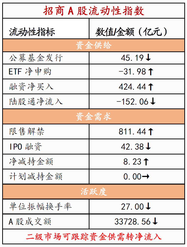 ⚑ 资金供需:二级市场可跟踪资金净流入。北上资金流出,净流出152.1亿元;融资余额上升,融资资金净买入424.4亿元;ETF净流出32.0亿元;新成立偏股类公募基金份额减少。重要股东由净增持转为净减持,无计划减持。