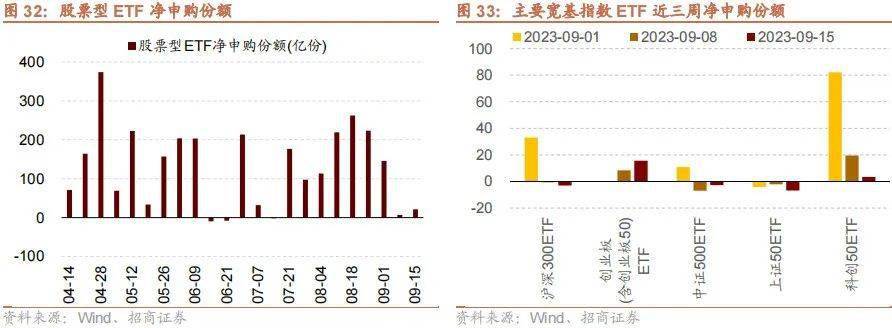 上周(9/11-9/15)ETF净申购,当周净申购21.1亿份,宽指ETF申赎参半,其中创业板(含创业板50)ETF申购较多,上证50ETF赎回较多;行业ETF申赎参半,其中新能源&智能汽车ETF申购较多,医药ETF赎回较多。具体的,沪深300ETF净赎回3.0亿份;创业板ETF净申购15.7亿份;中证500ETF净赎回2.8亿份;上证50ETF净赎回6.7亿份。双创50ETF净申购7.9亿份。科创50ETF净申购3.5亿份。行业ETF方面,信息技术行业净申购1.6亿份;消费行业净赎回0.1亿份;医药行业净赎回19.2亿份;券商行业净申购3.6亿份;金融地产行业净申购3.6亿份;军工行业净申购2.9亿份;原材料行业净赎回1.0亿份;新能源&智能汽车行业净申购4.6亿份。