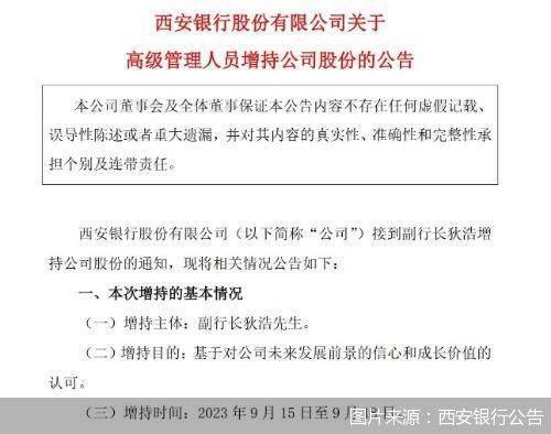 又有高管自掏腰包增持自家银行股份。9月18日,西安银行发布公告称,基于对该行未来发展前景的信心和成长价值的认可,该行副行长狄浩以自有资金在9月15日-18日合计增持该行股份21.65万股,占总股本的0.0049%,增持价格区间为3.57-3.65元/股,增持后狄浩持有股份22.89万股,占该行总股本的0.0052%。