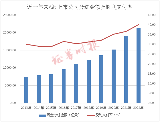 持续稳定的高分红不仅能体现出上市公司业绩稳健、现金流充裕的实力,还彰显出上市公司长期稳定的成长性与内在投资价值。而从股利支付率看,近十年,A股上市公司股利支付率不断增长,2022年达到40.30%,较2013年的30.08%增长明显。