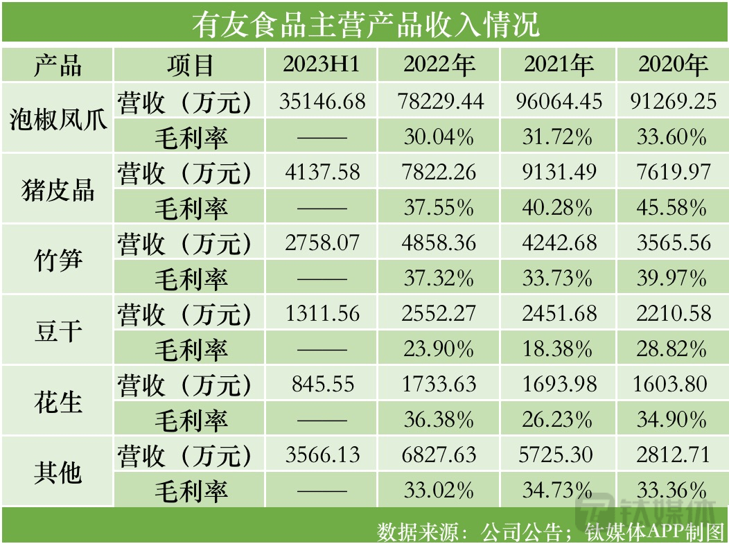 针对原材料涨价,有友食品分别于2022年、2023年对泡椒凤爪等部分产品提价。且鹿有忠在回复钛媒体APP提问时谈到:“公司建立健全原材料价格与产品售价的联动机制,根据不同品种原材料的市场价格变化情况、备货周期等因素,有计划地提前储备适当的原材料。”