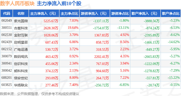 从资金流向上来看,当日数字人民币板块主力资金净流出6.54亿元,游资资金净流出4360.98万元,散户资金净流入6.98亿元。数字人民币板块个股资金流向见下表: