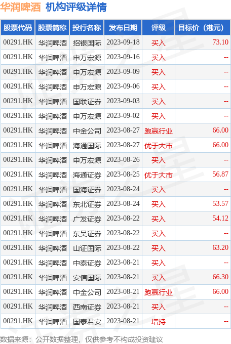 截至2023年9月20日收盘,华润啤酒(00291.HK)报收于42.45港元,下跌2.08%,换手率0.47%,成交量1520.62万股,成交额6.41亿港元。投行对该股的评级以买入为主,近90天内共有46家投行给出买入评级,近90天的目标均价为66.16港元。招银国际最新一份研报给予华润啤酒买入评级,目标价73.1港元。