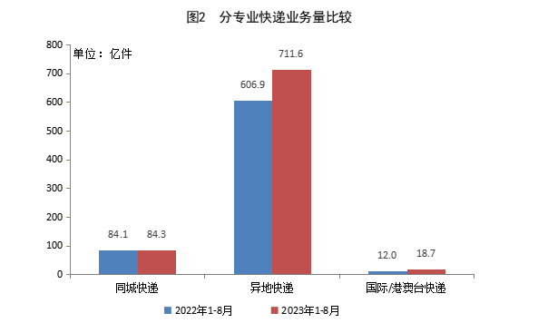 分业务来看,1-8月,同城快递业务量累计完成84.3亿件,同比增长0.2%;异地快递业务量累计完成711.6亿件,同比增长17.3%;国际/港澳台快递业务量累计完成18.7亿件,同比增长56.3%。值得一提的是,1-8月,快递与包裹服务品牌集中度指数CR8为84.1,较1-7月下降0.2,这也意味着,快递行业竞争依然激烈。