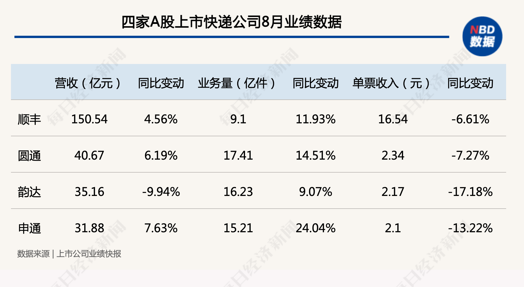 圆通速递8月快递产品收入40.67亿元,同比增长6.19%;完成业务量17.41亿票,同比增长14.51%;韵达股份8月快递服务业务收入35.16亿元,同比下降9.94%;完成业务量16.23亿票,同比增长9.07%;申通快递8月快递服务业务收入31.88亿元,同比增长7.63%;完成业务量15.21亿票,同比增长24.04%;