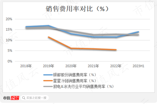 主打品牌的银都股份,其销售费用率要比主打贴牌的星星冷链高出5-6个百分点,甚至与家用厨电行业的销售费用率均值持平。