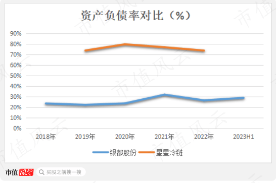 对比明显的是隔壁的星星冷链,截至2022年6月末,账面上的货币资金4.61亿、长短期借款9.93亿、资产负债率73.61%,实属凄惨得多!