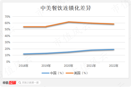 也因此,美国的餐饮连锁化率要远高于中国,差出了近40个百分点。